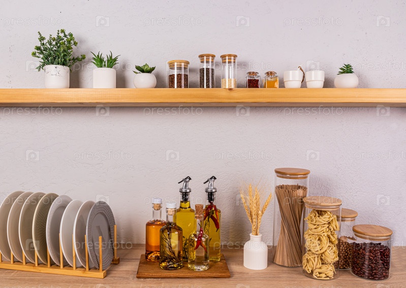 Открытая кухонная полка и часть деревянной кухонной столешницы с набором емкостей для хранения продуктов и сушилкой с тарелками. Передний план