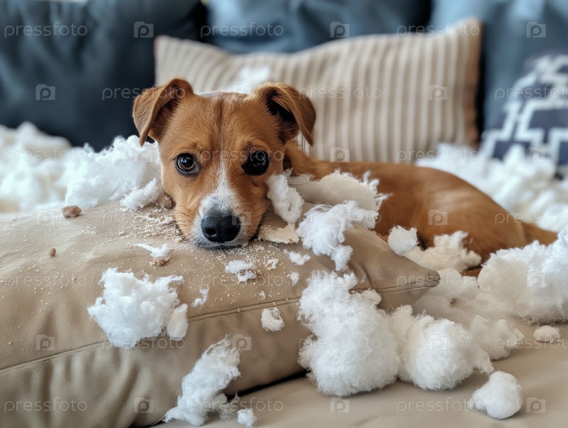 Собака на кровати, покрытая измельченной подушкой