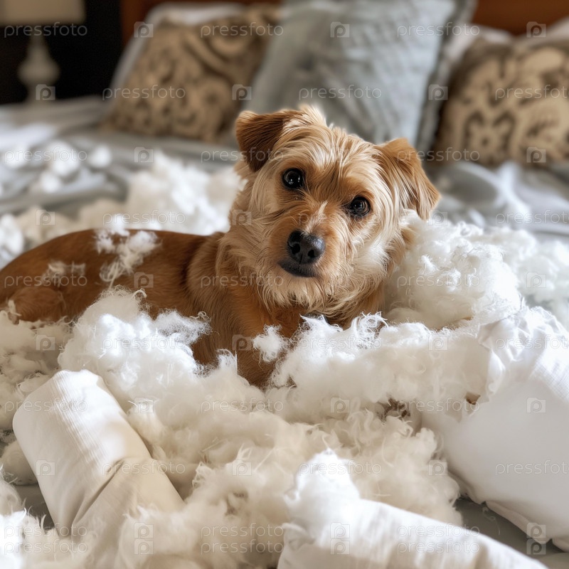 Собака на кровати, покрытая измельченной подушкой