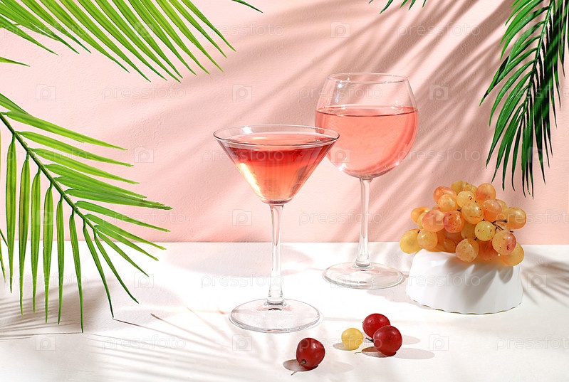 Праздничные алкогольные коктейли, бокалы вина и мартини на современном фоне с тенями, концепция бара, алкогольные напитки на вечеринке, баннер для рекламы ресторана или кафе
