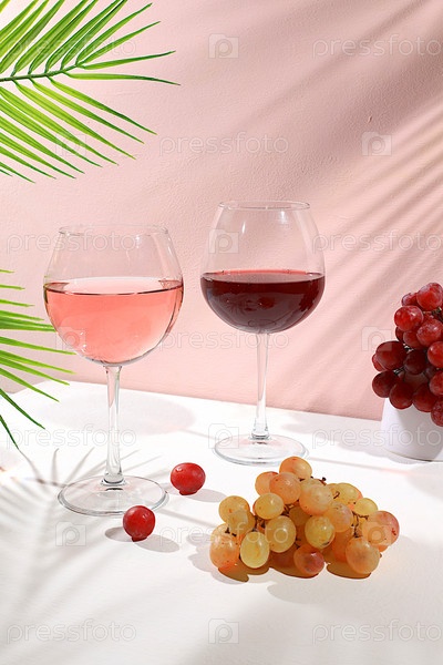 Праздничный алкогольный коктейль, бокалы красного и белого вина на фоне с тенями, концепция бара, алкогольные напитки на вечеринке, баннер для рекламы ресторана или кафе,