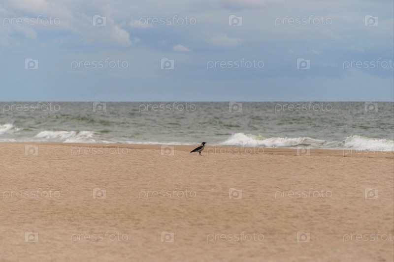 Песчаный осенний пляж, волны на море и облака на заднем плане