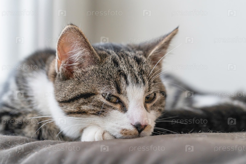 Милый молодой кот греется на солнце на подоконнике