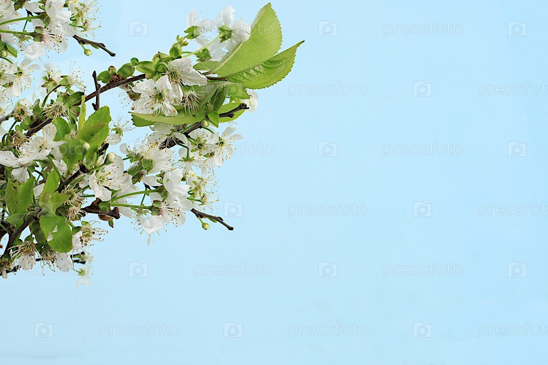 Красивые цветущие ветки вишни на светлом фоне. Абстрактная цветочная композиция, натюрморт, весенний фон или баннер, праздничная концепция. Открытка на День матери, Женский день, С Днем Рождения, Свадьбу, выборочный фокус