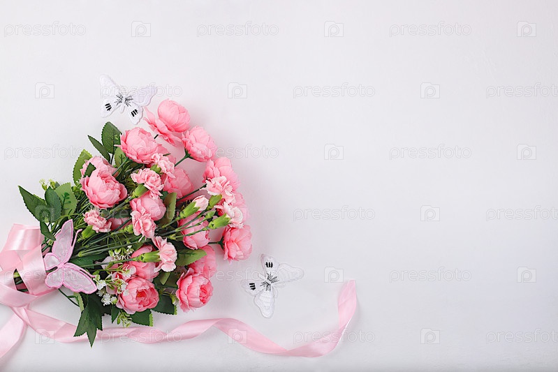 Красивые цветы и бабочки на светлом фоне. Абстрактная цветочная композиция, натюрморт, весенний фон или баннер, концепция праздника. Открытка на День матери, Женский день, С Днем Рождения, Свадьбу, выборочный фокус
