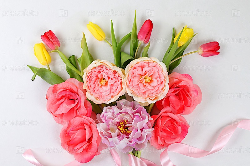 Весенняя или летняя цветочная композиция, натюрморт, баннер, минимальная концепция праздника. Поздравительная открытка на день матери, женский день, день святого валентина, с днем рождения, свадьбу, выборочный фокус, подарок для близких,
