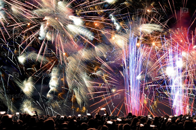 Красочный праздничный салют на городском празднике. Люди смотрят рождественский фейерверк. Концепция Нового года. Взрывы красочных абстрактных огней