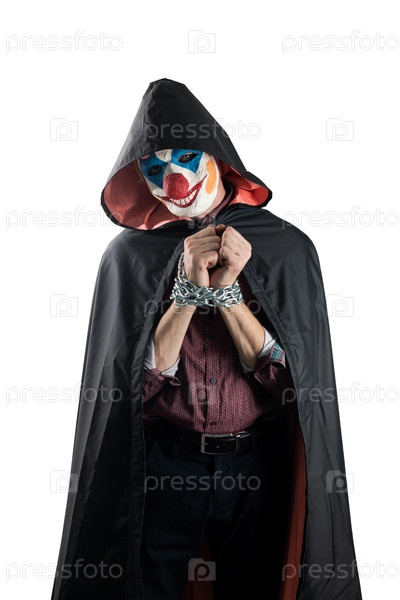 Клоун со скованными руками. На белом изолированном фоне