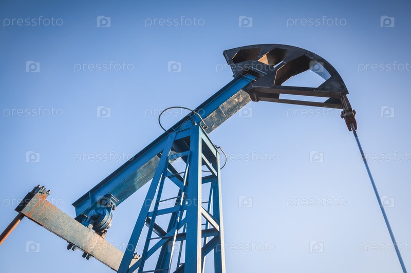 Масляный насос на фоне голубого неба и утреннего солнца, солнечные блики на масляном насосе
