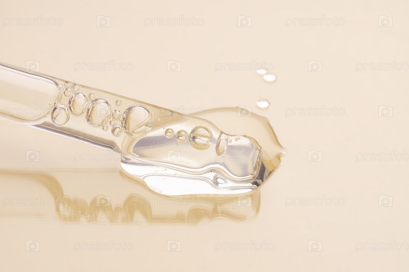 Пипетка с сывороткой, гелем, маслом или другим косметическим продуктом на бежевом фоне. макрос