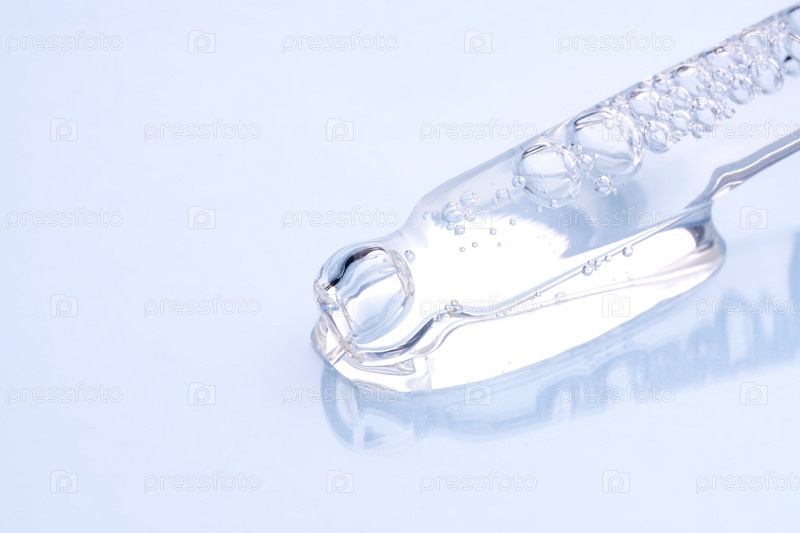 Жидкий прохладный синий гель или сыворотка на синем стекле фона микроскопа