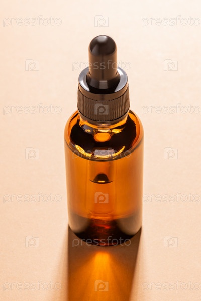 Косметическая бутылочка темного стекла с капельницей на бежевом фоне. Концепция натуральной косметики, натуральное эфирное масло и средства по уходу за кожей