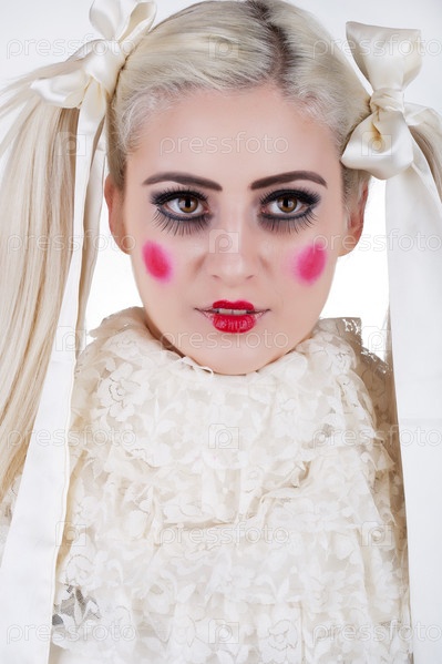 Портрет милой блондинки с длинными волосами и кукольной кожей
