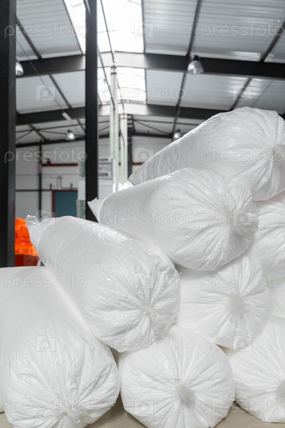 Куча мешков с сыпучей гранулированной пеной на коммерческом складе