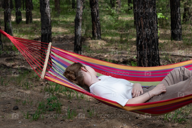 Красивая молодая женщина отдыхает в гамаке в лесу. Летние пейзажи, прекрасное утро на лоне природы. Девушка восхищается видами и природой. Подышал свежим воздухом. Красивый утренний свет