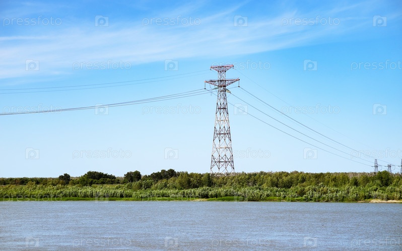 Линии высокого напряжения и опоры электропередач в плоском и зеленом сельскохозяйственном ландшафте в солнечный день с перистыми облаками в голубом небе