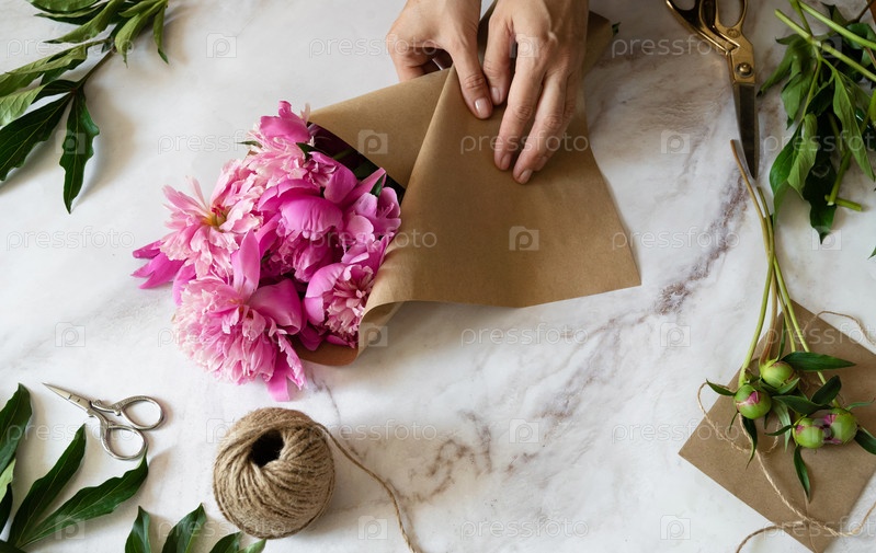 Флорист за работой: красивая женщина делает летний букет пионов на рабочем сером столе. Крафт-бумага, ножницы, конверт для поздравления на столе. Вид сверху. Плоская композиция