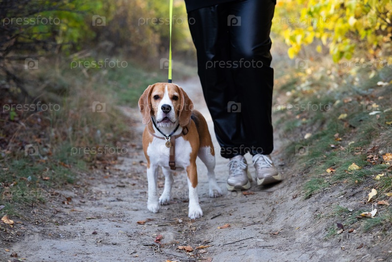 Щенок бигля смотрит вверх. Портрет домашнего животного в помещении