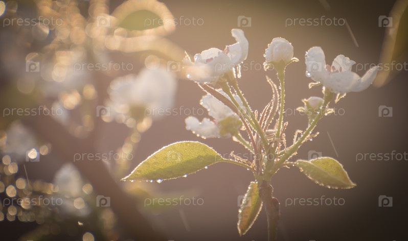 Весенняя цветущая яблоня, цветы яблони на закате в каплях дождя