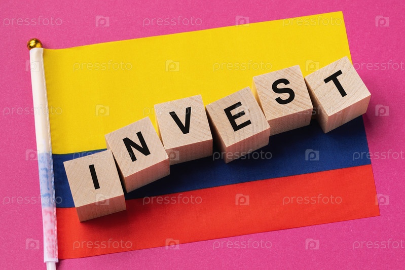 Деревянные кубики с текстом и флагом на цветном фоне, концепция инвестиций в Колумбию
