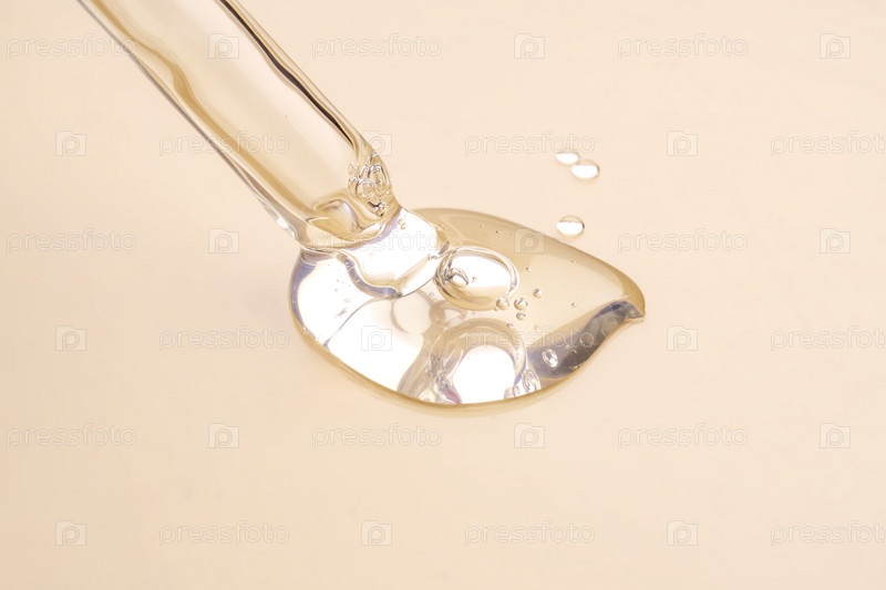 Гель косметического продукта или коллагеновая сыворотка вытекают из пипетки с пузырьками на бежевом фоне
