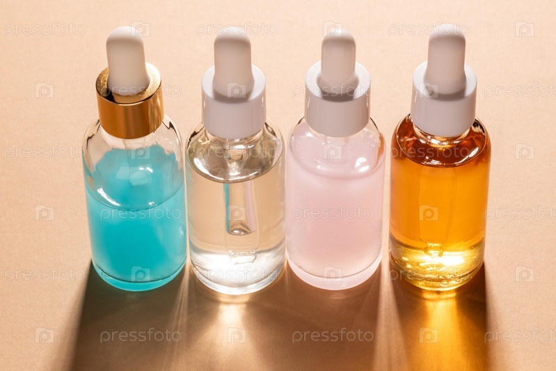 Набор из четырех косметических сывороток в стеклянных флаконах-капельницах на бежевом фоне. Реклама косметических товаров по уходу за кожей