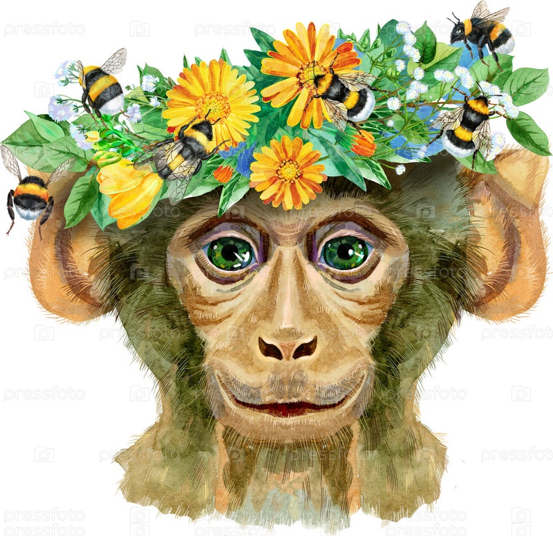 Персонаж гороскопа головы обезьяны изолирован на белом фоне. Обезьянка акварельная иллюстрация с брызгами