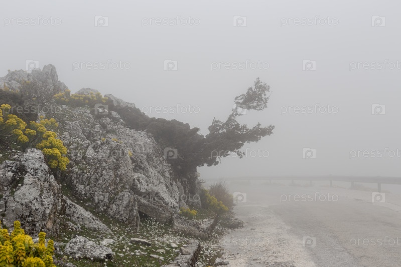 Сельская дорога (остров Кефалония, Греция) в туманный день