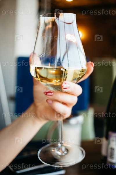 Женщина держит в руке бокал с белым вином