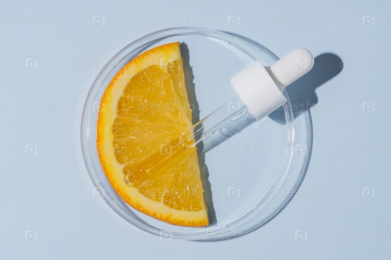 Чашка Петри с ломтиком апельсина и косметической пипеткой. Исследование цитрусовых кислот по уходу за кожей. Тестирование средств по уходу за кожей