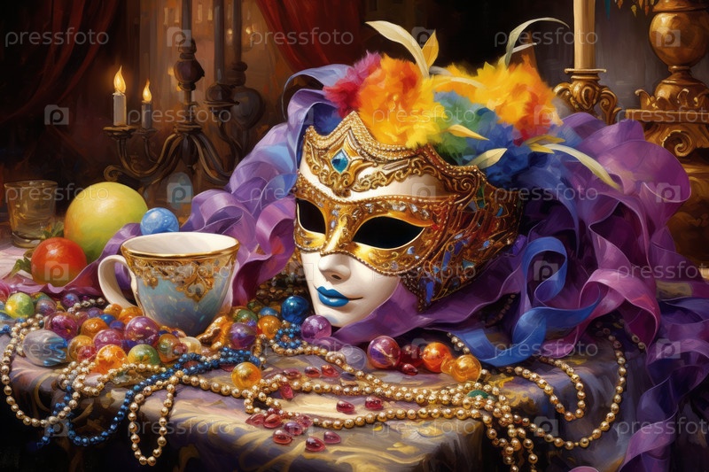Праздничная, красочная Марди Гра или карнавальная маска и бусы на золотом, зеленом и фиолетовом фоне