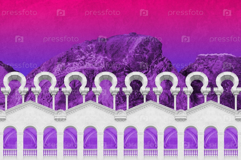 Сюрреалистический коллаж с элементами классической архитектуры. Художественный постер, концепция, обложка журнала. Античный городской пейзаж