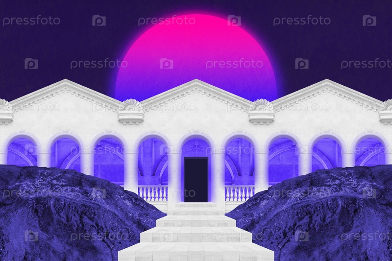 Художественный постер, концепция, обложка журнала. Сюрреалистический коллаж с элементами классической архитектуры. Античный городской пейзаж