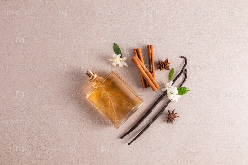 Прозрачный флакон духов с изысканным ароматом корицы и ванили на бежевом фоне с палочками корицы и ванили. Вид сверху