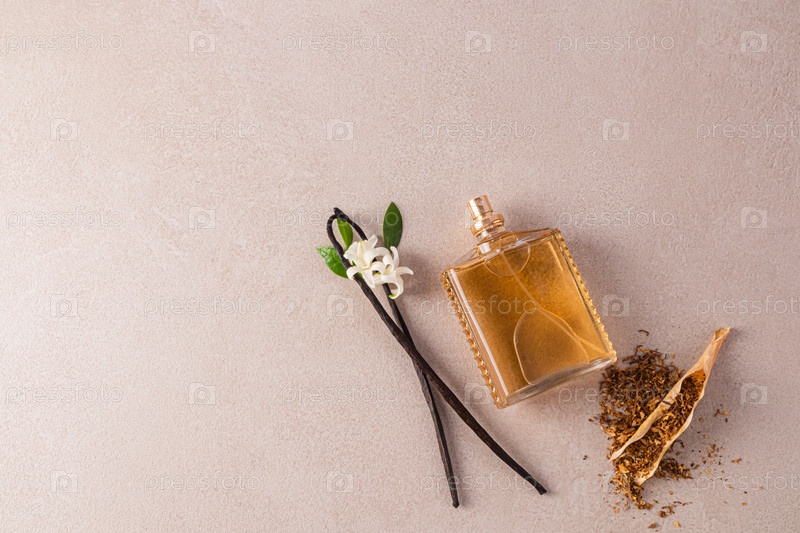 Шикарный флакон косметического спрея, духи на бежевом каменном фоне с ванильными палочками и табачным листом. Яркий и красивый аромат