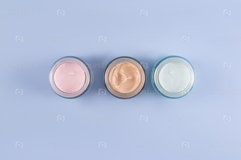 Три красивые стеклянные косметические баночки с нежной текстурой крема для ухода за лицом и телом на синем фоне. Вид сверху. Копировальное пространство. презентация