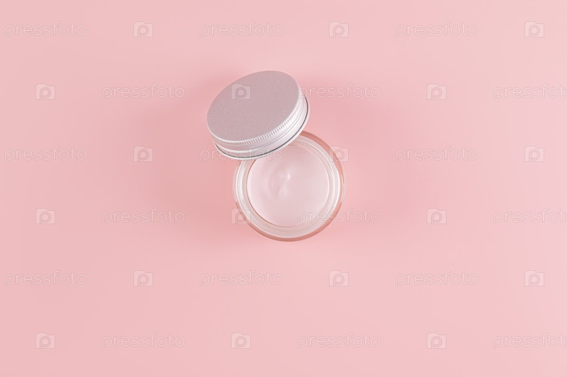 Нежный розовый крем для ухода за кожей лица и тела на розовом фоне. Открытая банка. Презентация продукта. Омолаживающий крем. Вид сверху