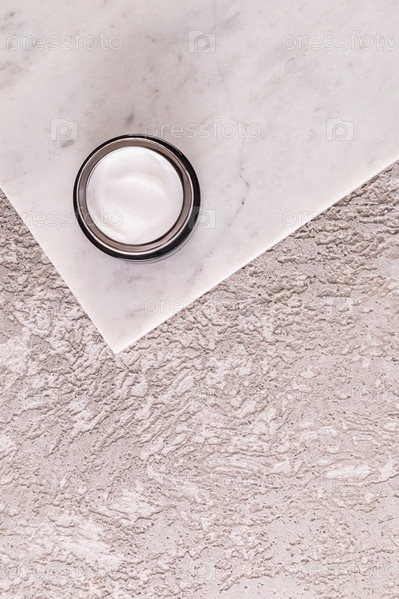 Косметическая банка из темного стекла с белым кремом для лица и тела на белом мраморном подиуме и сером цементном фоне. Вид сверху. Место для копирования