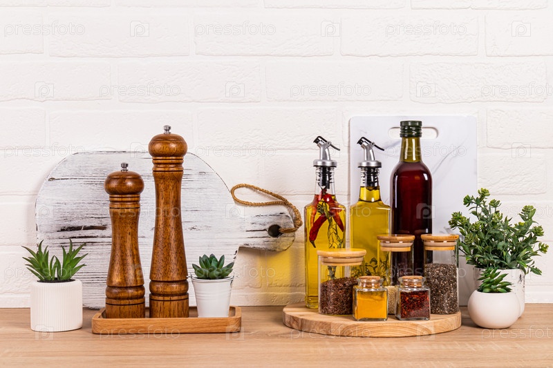 Множество различной кухонной утвари, бутылок с маслом, мельницы для специй и растений в горшках. Современный вид кухонного пространства. Экологичная кухня. Передний план