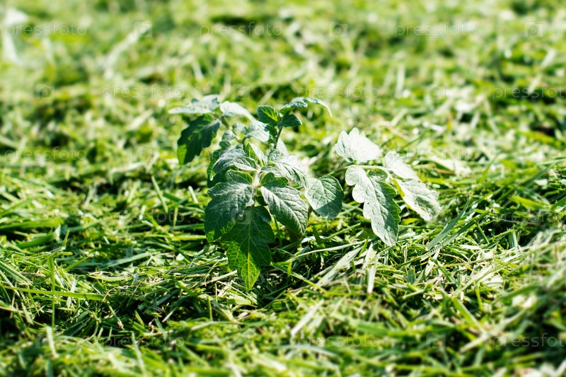 Мульчирование верхнего слоя почвы на овощной грядке скошенной травой с газона. производство биогумусных органических удобрений. Эрозия земли