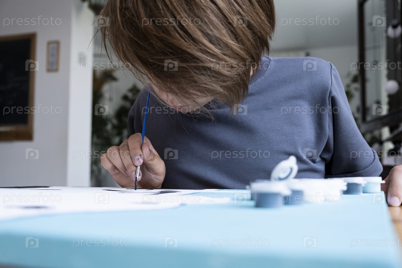 Мальчик с длинными темными волосами рисует картинку по номерам