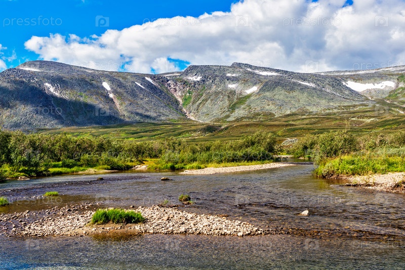 Холодный ручей и горный хребет в летний день