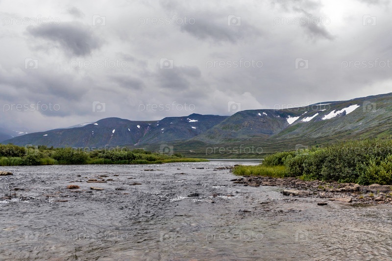 Холодный ручей и горный хребет в летний день