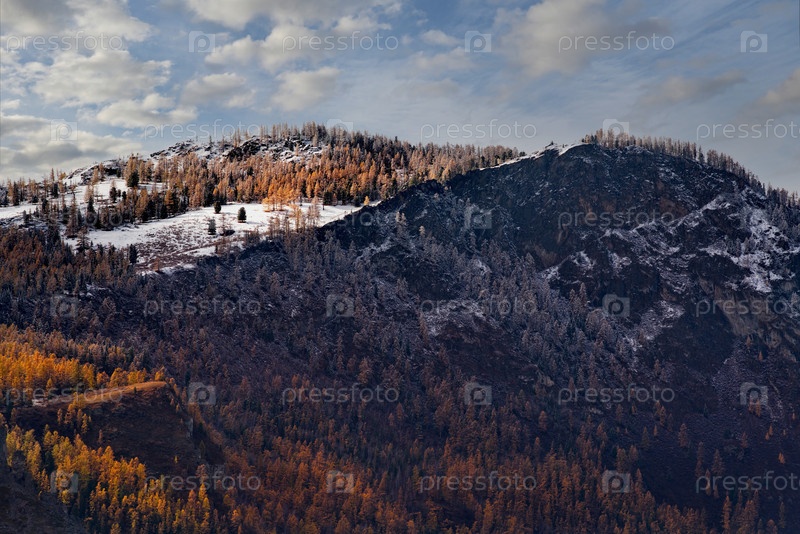 Россия. Горный Алтай. Туман, переходящий в снежные облака вокруг горных вершин в долине реки Чулышман на юге Телецкого озера