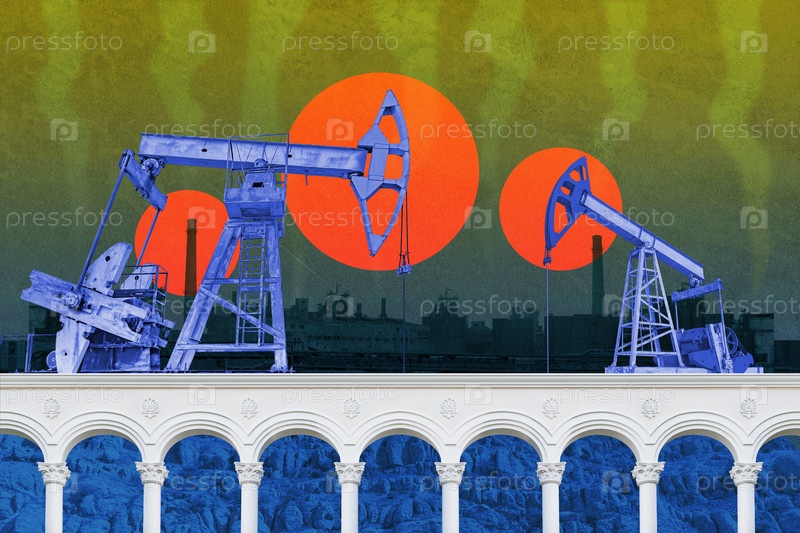 Классическая архитектура и промышленный масляный насос. Плакат с арт-концепцией, печать, обложка журнала. Сюрреалистический коллаж