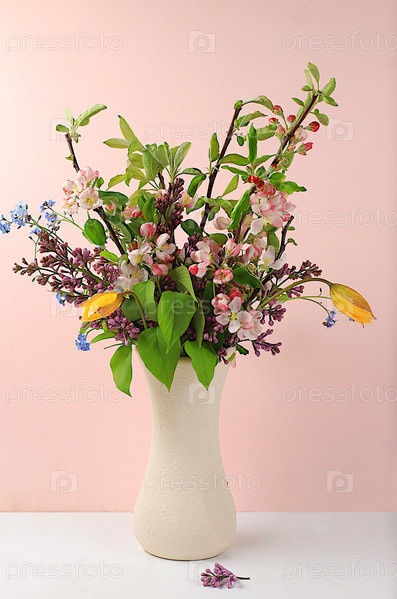 Абстрактная цветочная композиция, цветущие ветки яблони, незабудки и сирень в вазе на светлом столе, привет весенняя концепция, шаблон для дизайна, натюрморт с цветами,