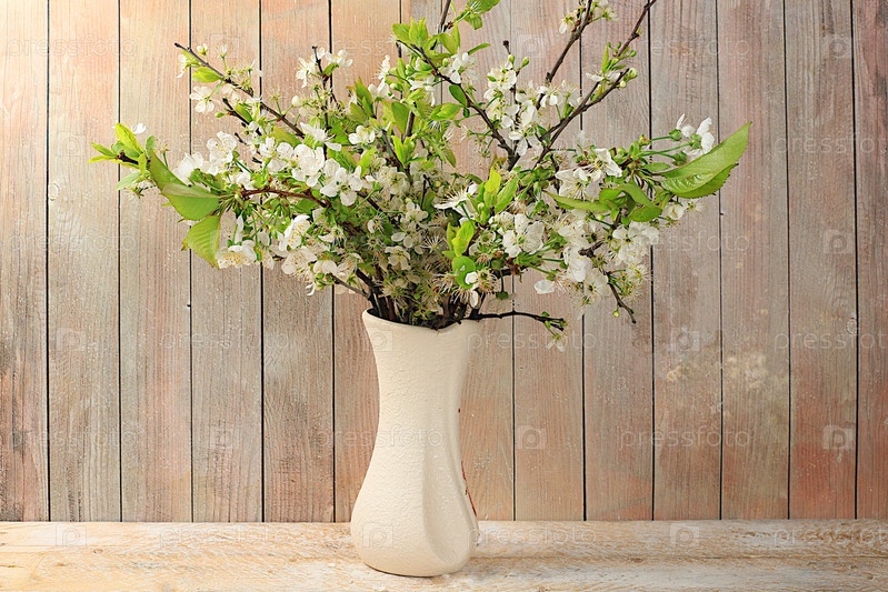 Абстрактная цветочная композиция, цветущие ветки вишни в вазе на светлом столе, привет весенняя концепция, шаблон для дизайна,