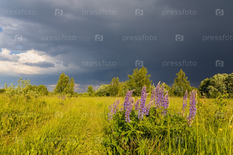 Пейзаж с люпинами и грозовым небом