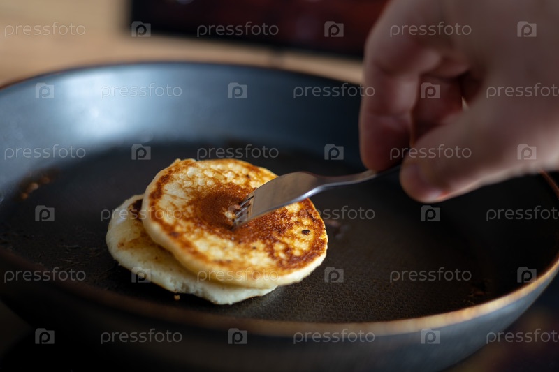 Рука втыкает вилку в оладьи на сковороде