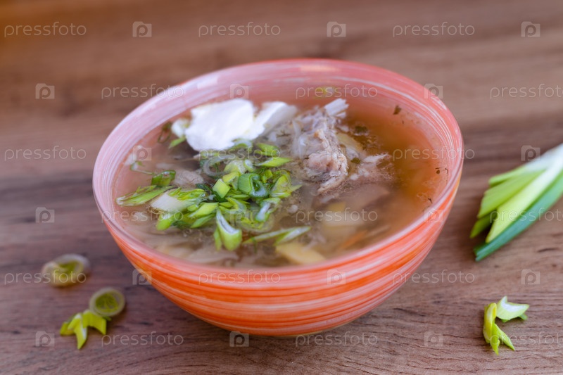 Тарелка с щами со сметаной и зеленым луком